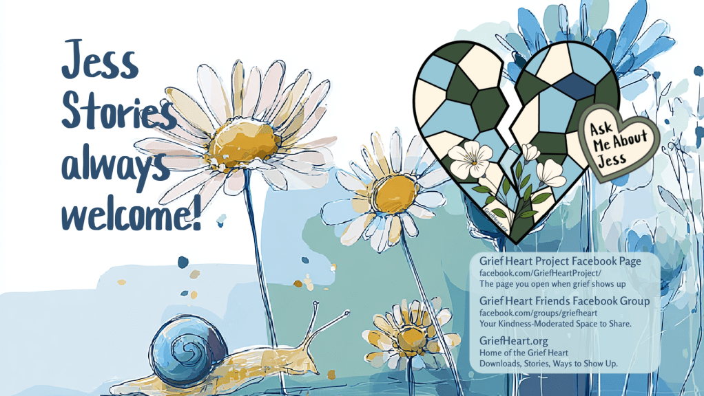 Here you will find logistics and stories about the Grief Heart Project and personal reflections about my journey with grief since losing my Daughter Jessica F17 in a car accident.